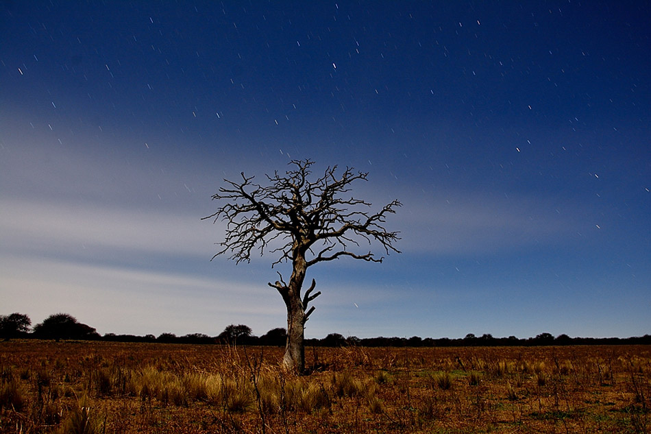 Para la foto, esperé que despejara el cielo, ya que esos días estuvo nublado. Tenía una semana y este fue el único día de mi estadía en el campo para poder hacer la foto. En frente al puesto en que me encontraba, la luz de la luna iluminaba la silueta del caldén, lo que me trajo a la cabeza realizar la imágen. Las nubes para un lado decoraban la composición, hacia otro lado no había nubes y la neblina comenzaba a avanzar. quedaron en mi retina muchas otras imágenes sin poder hacer, pero ya volveré a esas tierras.