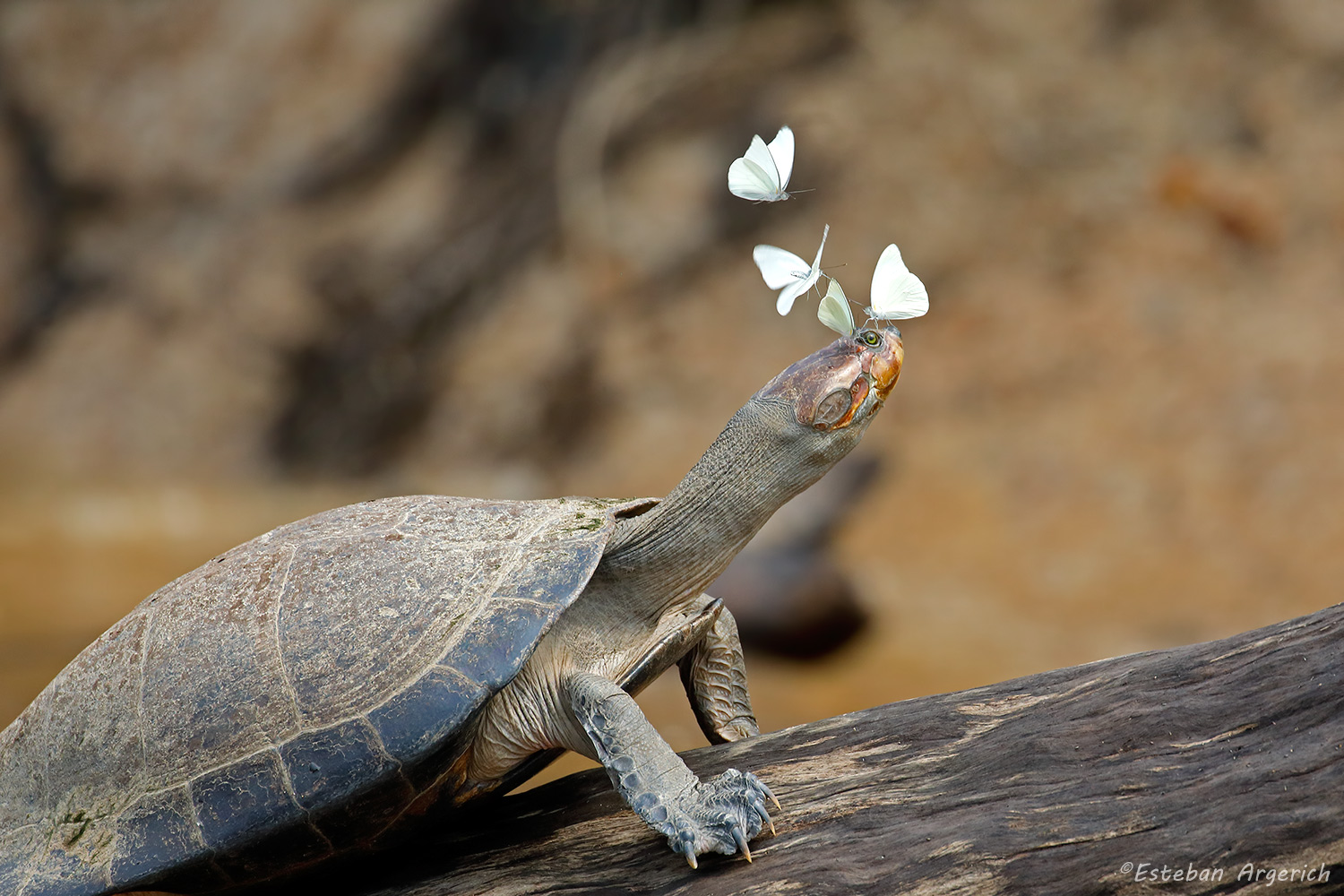 Adrian Zapata me ha comentado que las mariposas son de la familia Pieridae y, por lo que alcanzo a ver en la que está de perfil con las alas semi-abiertas, aventuro a que pertenece al género Ascia (quizás A. monuste?). Lo que está retratado es un comportamiento bastante difundido entre las mariposas de zonas tropicales (diferentes especies de diferentes familias): van a sorber lágrimas de los vertebrados (especialmente las tortugas porque no las molestan) y así obtienen su "cuota" de sodio, tan escaso en estos tipos de ambientes. |
