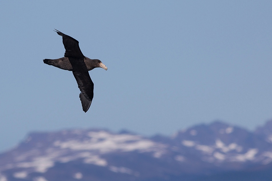 El Petrel Gigante Común, con sus mas de 2 metros de envergadura, destaca sobremanera mientras surca los cielos sobre el canal de Beagle teneindo como telón de fondo los picos nevados de la isla Navarino.