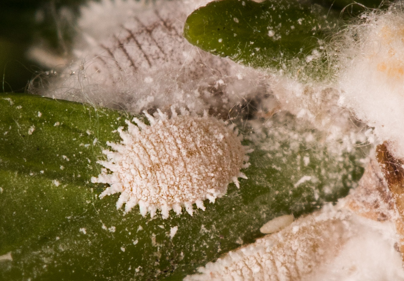 La cochinilla algodonosa es un insecto diminuto. Las hembras miden aproximadamente 3/16 pulgadas (5 milímetros) de largo y 2/16 los machos. Este insecto es muy parecido a una chinche harinosa, pero es más grande y tiene la parte delantera del cuerpo color rojizo. No posee proyecciones alrededor del cuerpo como las chinches harinosas. Este insecto segrega una sustancia harinosa o algodonosa sobre el cuerpo que utiliza para protegerse de los depredadores. La cochinilla algodonosa se caracteriza por poseer un saco blanco alargado en la parte posterior del cuerpo. Este saco es de 2 a 2.5 veces más largo que el cuerpo del insecto y almacena alrededor de 600 a 800 huevos.