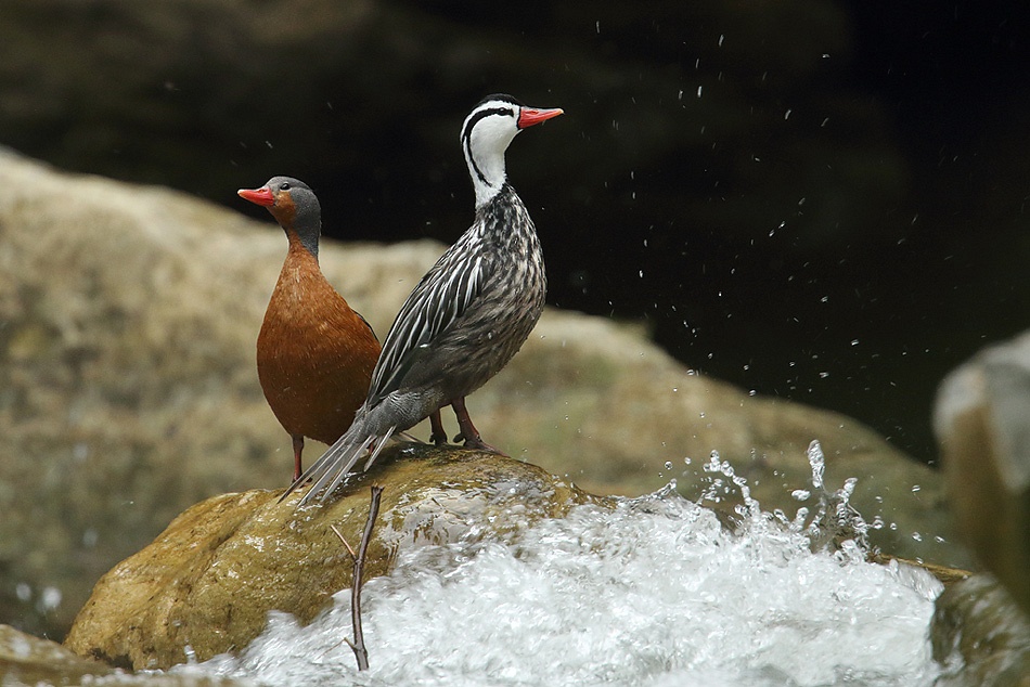 Una pareja de Pato de torrente con el agua rápida de un río de las yungas.