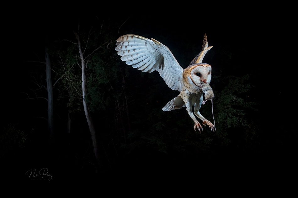 “Dos domingos atrás, terminando el día en una zona rural cerca de Buenos Aires, escuche un sonido de ave rapaz que me resulto muy extraño, por el horario y por ser constante. Eran ya las 20 hs y desde un cañaveral se repetía el sonido. Me acerque hasta el lugar linterna en mano, y descubrí que el sonido provenía de un viejo molino abandonado en una casa vecina. En pocos minutos, ya estaba subiendo unos 10 metros por la delgada escalera del molino para ver de que se trataba. Grande fue mi sorpresa al asomarme dentro del tanque del molino y ver dos grandes pichones de Lechuza Campanario, que con sus grandes ojos me miraban desde el fondo del viejo tanque. Partí de ahí imaginando la posible foto, pero pensando en la dificultad de armar una cámara a esa altura. Pasaron unos días y volví al lugar acompañado de dos grandes amigos con la esperanza que todavía estén ahí los dos pichones, y ahí estaban. Eran las 16;30 hs y tenía que apurarme para armar todo el set antes del anochecer. Ancle fuerte la cámara en una morsa y aposté por orientar la cámara hacia un alto eucalipto donde supuse percharían antes de entrar al tanque. Tuve que hacer varias subidas mas para calibrar todo. Arme mi hide a buena distancia y a esperar control remoto en mano. 19;30 hs y veo con emoción llegar la primer lechuza y perchar donde supuse. Se veía muy blanca en la noche. Fue emocionante ver este bicho fantástico, con sus alas traslúcidas. A eso de las 11hs se levanto una terrible neblina que logro empañar mi lente y eso marco el fin de la sesión. La emoción de subir al molino para rescatar la cámara y encontrarme con esta foto, una gran Tyto Alba llevando comida a sus pichones. Solo los que amamos y nos emocionamos con la naturaleza lo podemos entender. Desarme todo y desanduve los 100 km que separan mi casa de este lugar con una sonrisa en la cara”