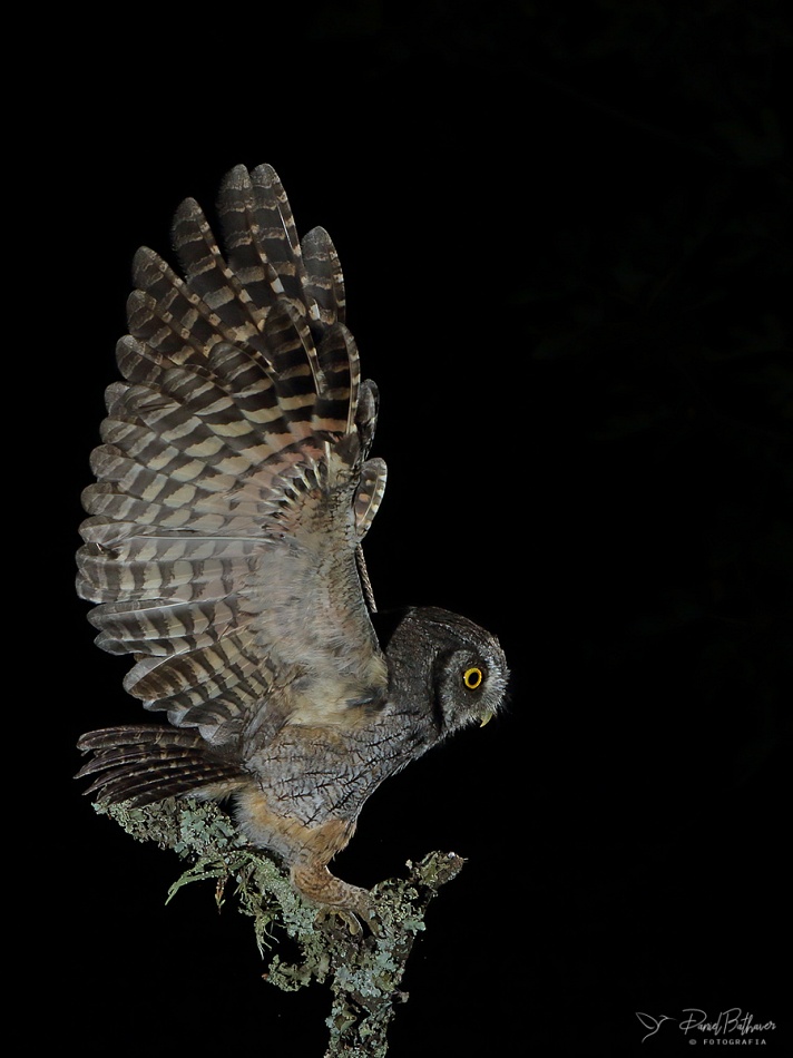 Hace un par de noches que venía escuchando durante horas cantar un alilicucú en el patio. Ayer a la tardecita arme todo. Primero busque un posadero y despues coloque 4 flashes y la barrera IR. Cuando oscureció puse el canto y a esperar. La idea era que entrara mas de frente, pero hizo un solo aterrizaje de costado y salió esta foto. Tengo muchas fotos al vuelo, aterrizando y despegando, pero comparto esta porque es fresquita.