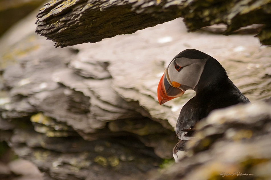 Esta ave extraña, el frailecillo atlántico, parece una mezcla de un pigüino por su figura y su torpe forma de desplazarse en tierra, y un ave colorida como un guacamayo, por los colores de su pico, de donde deriva, seguramente, su apodo de loro de mar. Esos colores llamativos son de verano y se opacan en invierno. Pueden bucear decenas de metros bajo el agua durante algunos segundos y vuelan hasta a 90km/h. La mayor parte del año viven solitarios en el mar y se reproducen en colonias, en la época de reproducción. En esta isla suele permanecer una colonia de varios miles de ellos en verano. La isla es la Gran Skellig y está abierta al público unos 8 meses por año, con un límite de unas 180 personas por día y unos pocos botes tienen permitido llegara a ella. Es muy común ver sus rostros con expresiones tristonas o pensativas, como en este caso.