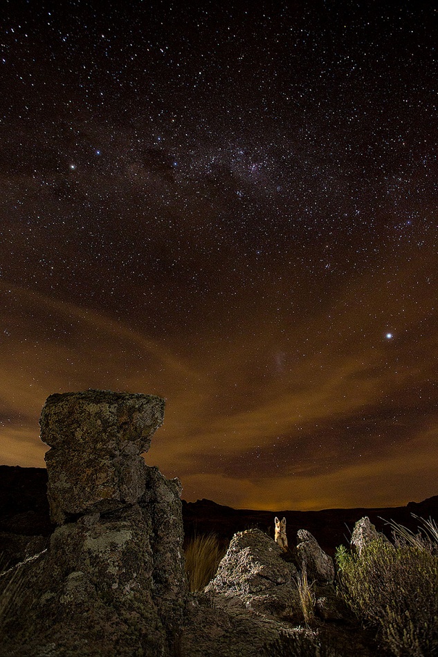 La idea era la vía láctea y el bicho, pero este no se quiso acercar tanto (aunque alcanzo a a activar la cámara) y por otro lado la tremenda contaminación lumínica que genera Córdoba capital en las nubes tapo parte de las estrellas. Creo, igual que el naranja de las nubes le da mucha fuerza a la imagen.