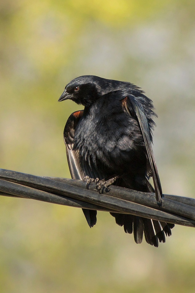 El ejemplar estaba solo, posado en el cable y de repente hizo un movimiento como de espasmo, tal vez para liberar tensión... o voltaje (digo) por el cable :)